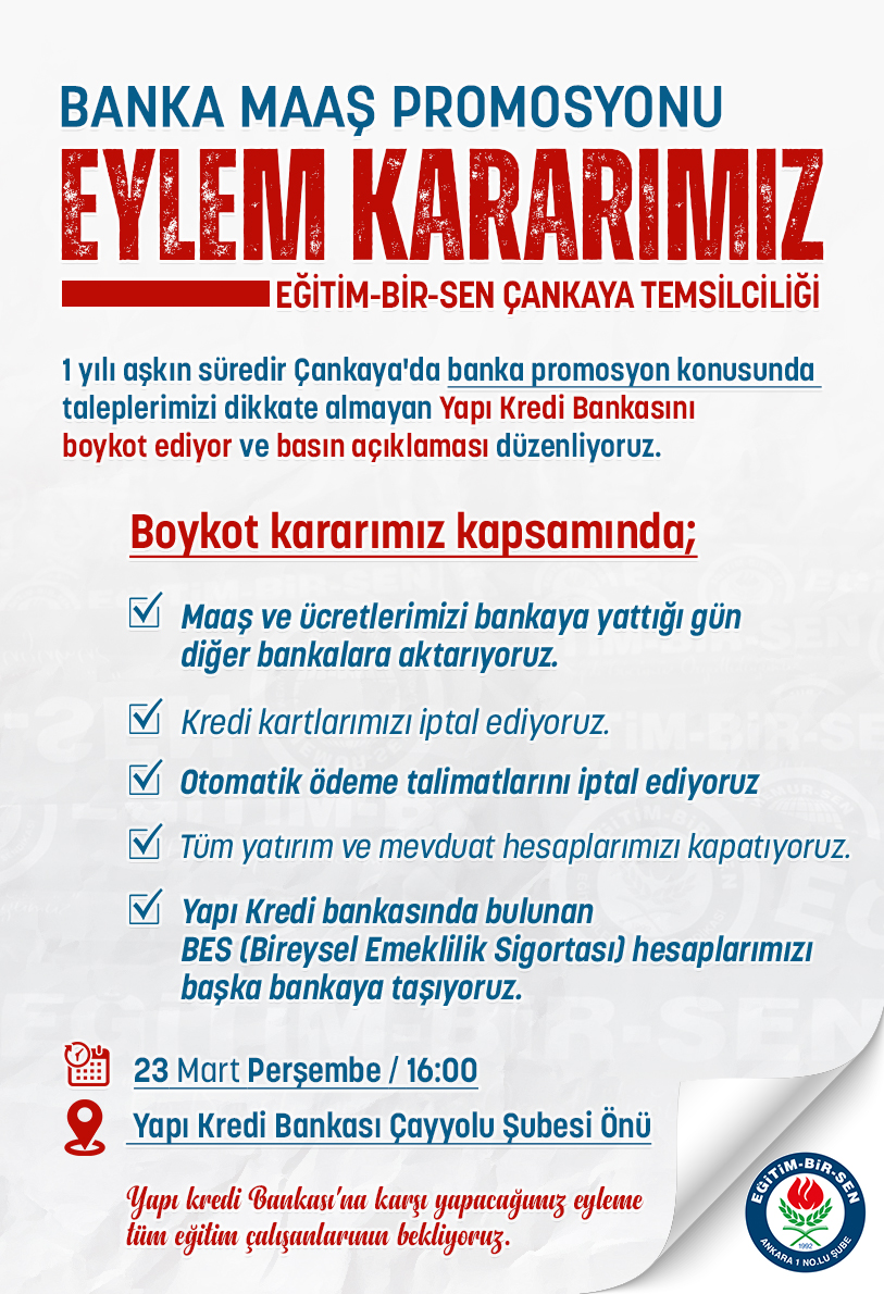 Bankanın, taleplerine karşı umursamaz tavrı nedeniyle müşteri olmaktan kaynaklanan bir dizi boykot kararı aldıklarını söyleyen Süslü, “Bütün eğitim çalışanlarından isteğimiz, bize bu haksızlığı reva gören bankaya tepkilerini göstermeleridir. Bu kapsamda şu kararları aldık: Maaş ve ücretlerimizi yattığı gün diğer bankalara aktaracağız. Kredi kartlarımızı iptal edeceğiz. Otomatik ödeme talimatlarımızı iptal edeceğiz. Tüm yatırım ve mevduat hesaplarımızı kapatacağız. Bireysel Emeklilik Sigortası hesaplarımızı başka bankalara taşıyacağız. Bizi, kafasına vurulup ekmeği alınan, hakkını korumaktan aciz bir kitle olduğumuz yanılgısına kapılan hadsizler varsa onlar varsa onları örgütlü gücümüzü göstereceğiz.” ifadelerini kulandı.
