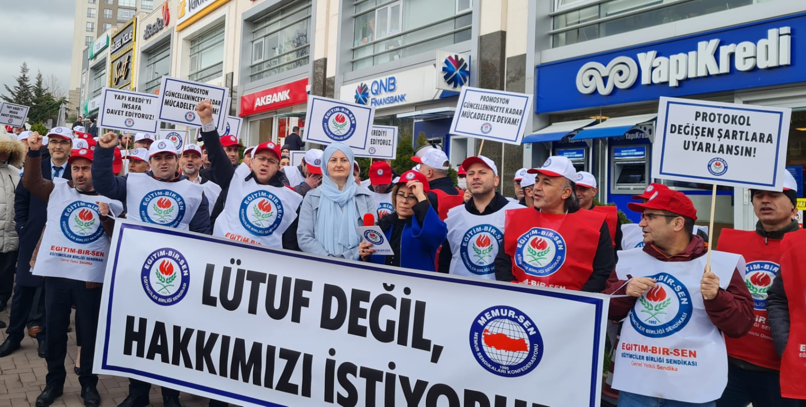 Banka önünde basın açıklaması yaparak ödenen miktarın yetersiz olduğunu söyleyen Eğitim-Bir-Sen Çankaya İlçe Başkanı Nedime Süslü, kendilerine ödenen promosyon miktarının ekonomik koşullar dikkate alınarak güncellenmesi gerektiğini söyledi.
